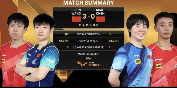 2025年WTT中國大滿貫混雙1/4決賽,王楚欽/孫穎莎以3比0(11比4、11比9、11比5)戰(zhàn)勝隊(duì)友陳垣宇/蒯曼,晉級(jí)四強(qiáng)。王楚欽/孫穎莎半決賽的對(duì)手是巴西組合雨果/高橋·布魯娜。