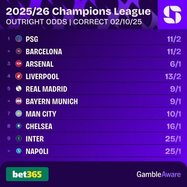 歐冠聯(lián)賽階段2輪戰(zhàn)罷,目前拜仁、皇馬、巴黎圣日耳曼、國(guó)際米蘭、阿森納、卡拉巴赫6支球隊(duì)保持全勝。最新奪冠賠率榜上,衛(wèi)冕冠軍巴黎與剛剛成為自己手下敗將的巴薩同為6.5,領(lǐng)跑群雄,其后是阿森納7、利物浦7.5、皇馬10、拜仁10、曼城11、切爾西17。 不過(guò),OPTA的測(cè)算結(jié)果與賠率不同:巴黎和巴薩都要靠后站,奪冠概率最高的是阿森納,達(dá)到18.1%,其后是利物浦14.7%、巴黎14%、曼城9.7%、拜仁9.5%、巴薩8.3%、皇馬4.9%。