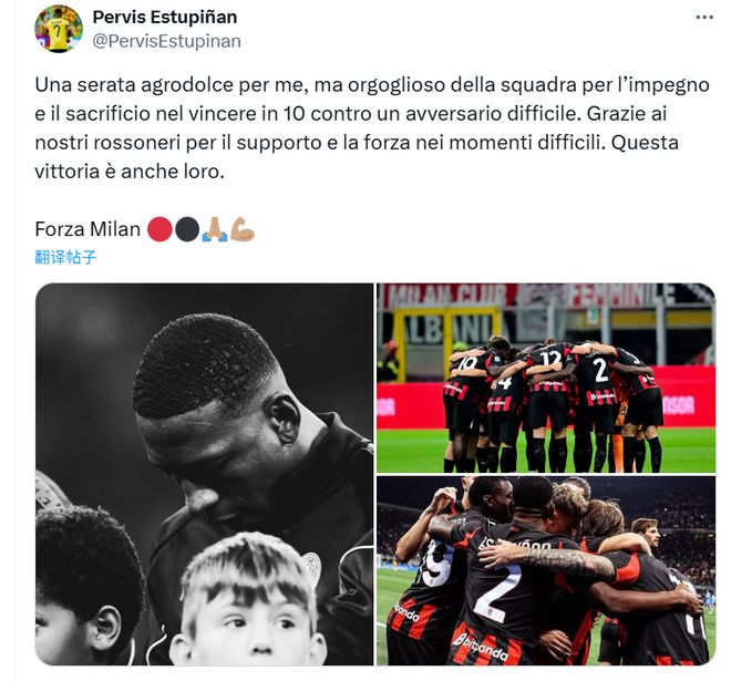 雷速體育9月29日宣 米蘭在本輪意甲焦點(diǎn)戰(zhàn)中2-1擊敗那不勒斯,新援左后衛(wèi)埃斯圖皮尼安首發(fā)出戰(zhàn),但在下半場送出紅點(diǎn)套餐。賽后埃斯圖皮尼安更新了社媒:“這是一個苦澀又甜蜜的