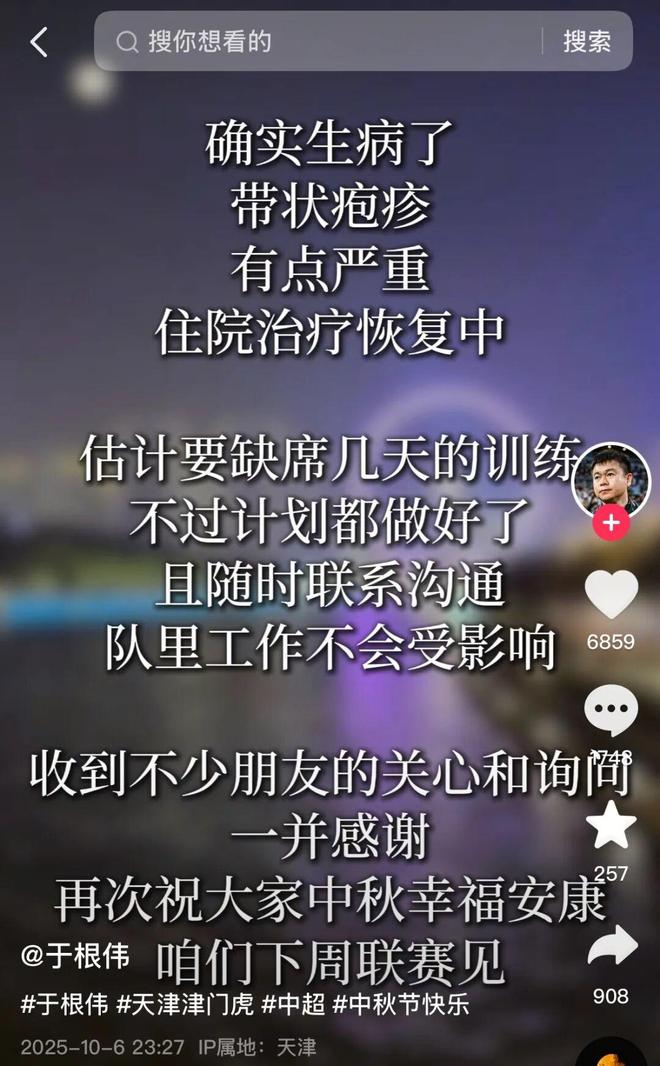 對此,于根偉本人昨天深夜在社交媒體回應(yīng):確實(shí)生病了,帶狀孢疹,有點(diǎn)嚴(yán)重。住院治療恢復(fù)中。估計(jì)要缺席幾天的訓(xùn)練,不過計(jì)劃都做好了,且隨時(shí)聯(lián)系溝通,隊(duì)里工作不會受影響。收到不少朋友的關(guān)心和詢問,一并感謝。再次祝大家中秋幸福安康,咱們下周聯(lián)賽見。